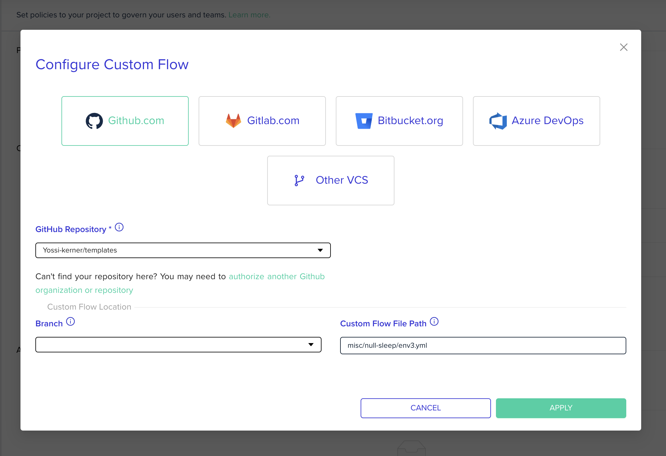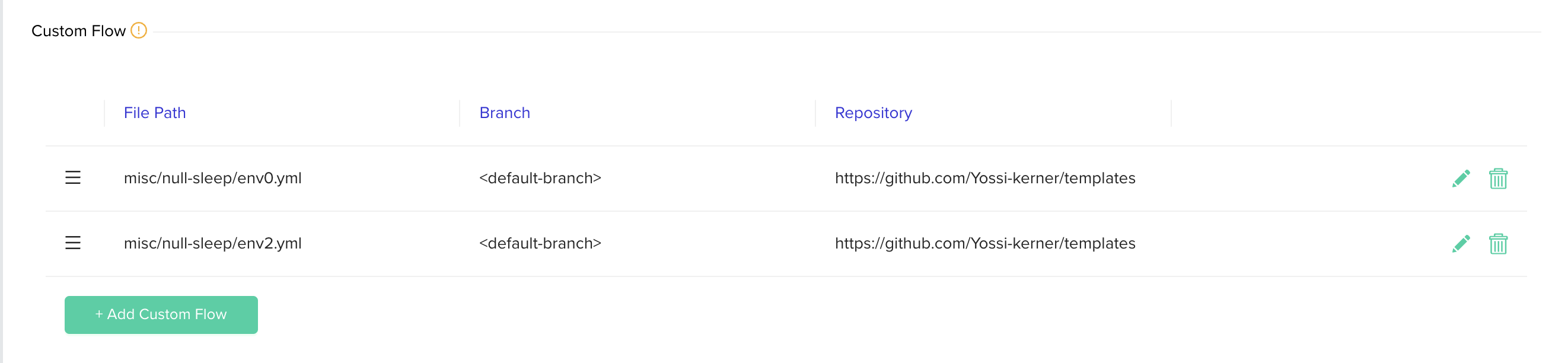 Project custom flows will override template custom flow- Project-level custom flows will override any existing custom flows configured for the environment. If there are no custom flows in the project’s hierarchy we will run the environment’s custom flow.Merge project custom flows with the template custom flow- Project-level custom flows will be merged with existing environment custom flow. The environment’s custom flow will run after the projects’ custom flows.