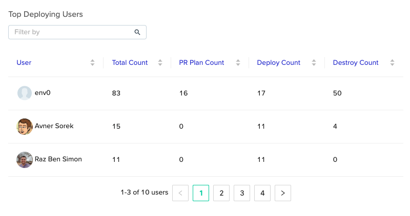 All users, ordered by default by total number of deployments from highest to lowest (can be ordered by other criteria as well).