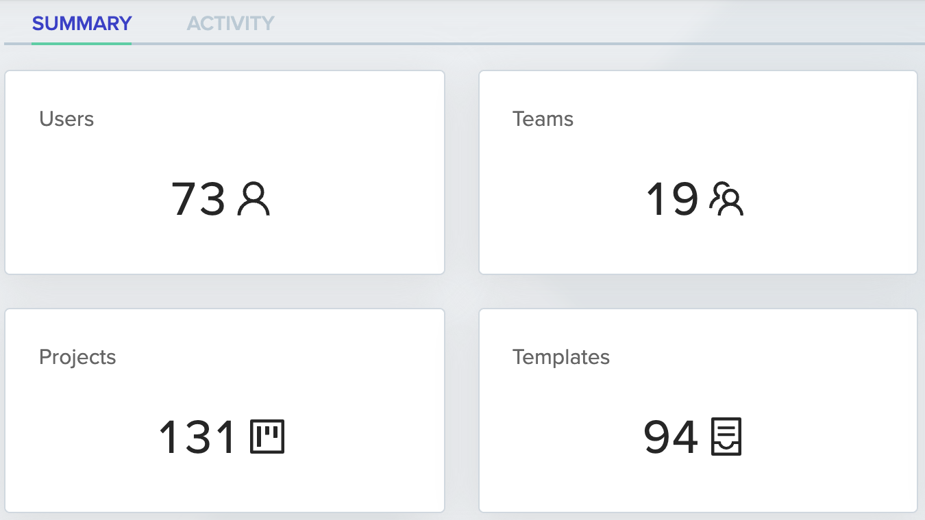 Shows total users, teams, projects, and templates.