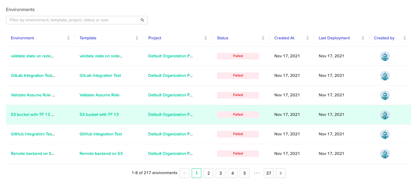 Contains all environments which can be filtered by several attributes such as name, project, status, etcโฆ