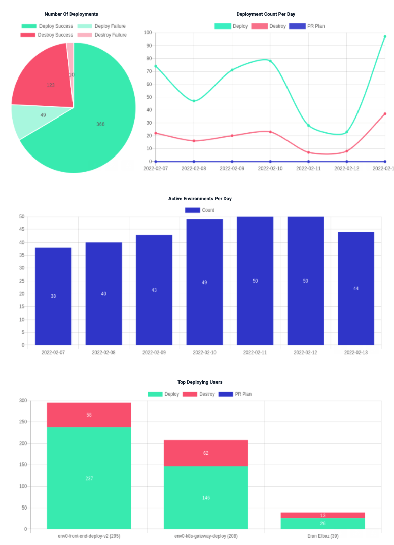 env zero will email organization admins a weekly summary of env zero platform usage, detailing how your teams are using env zero.This will include details about your environments, most active users, and deployments per day. The env zero digest email aggregates data from the past week into four graphs: