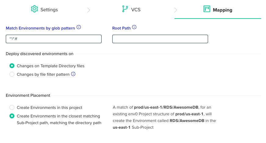 - Variables: Define the necessary Terraform or environment variables. These can be set at either the Environment or Project level.