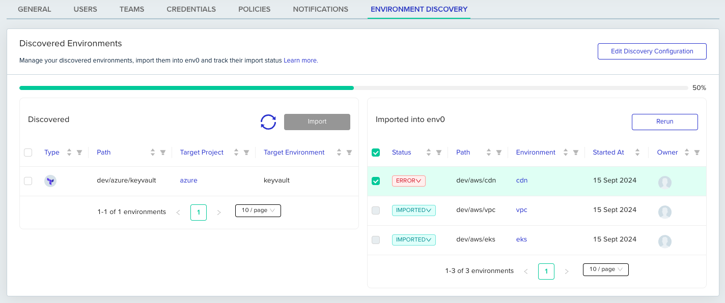 Mistakes can happenโwhether itโs a missed variable, incorrect credentials, or other human errors. These issues can cause an import to fail. To address this, env zero provides a Rerun option. You can select the environments that encountered errors, adjust their configurations as needed, and run the import process again.