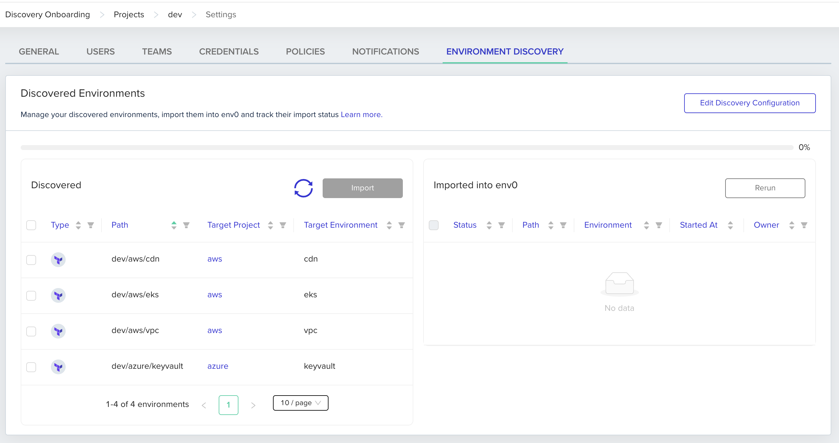 Once env zero has discovered your environments, you can initiate the import by selecting the desired environments and clicking the โImportโ button.