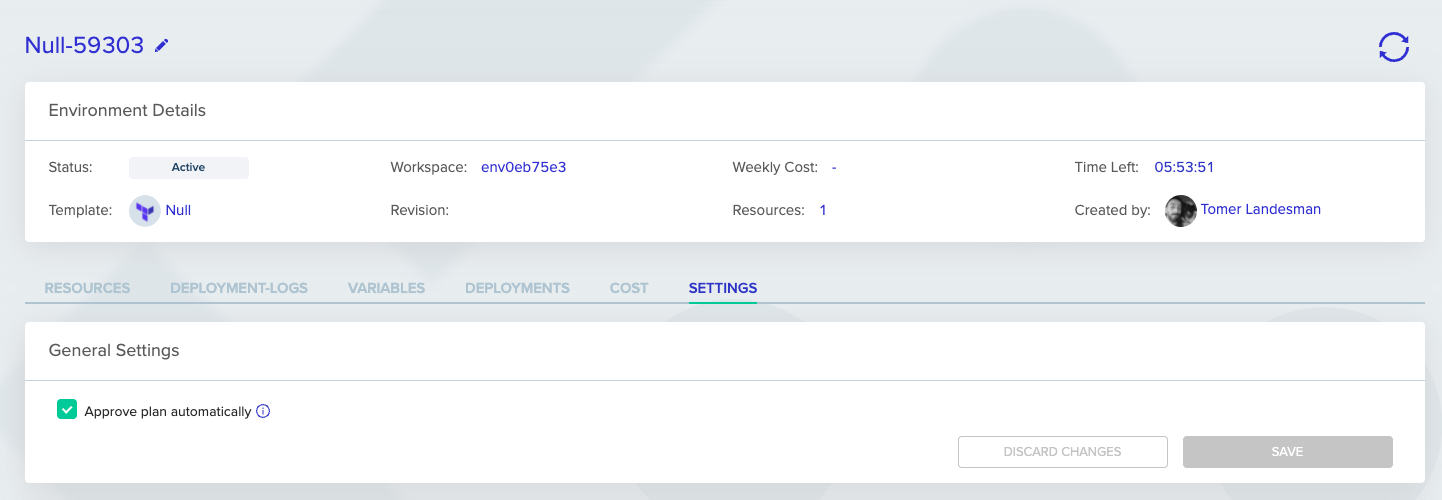For every flow executed on an environment (create, destroy, or redeploy), env zero first creates a Terraform Plan. Executing the plan requires approval from a user with Deployer privileges. Users with a Deployer or Admin role can have their action automatically approved by checking the “Approve plan automatically” checkbox. In this case, the plan will execute with no need for further approval. If you’d like to change an existing environment’s default behavior for this setting, you can set it through the environment view page, under the Settings tab in the General Settings card: