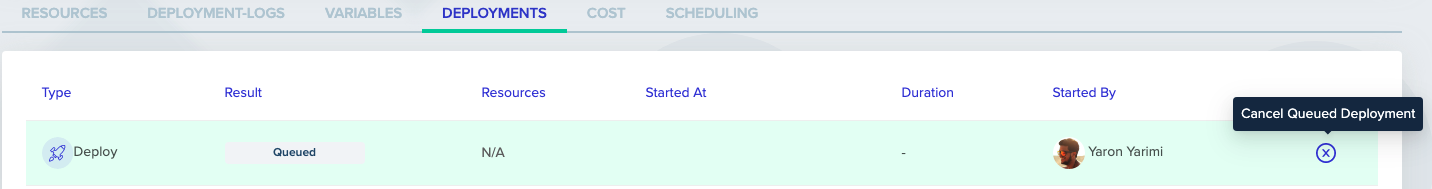 When your environment is in the process of a destroy or deploy, requested actions (deploy/destroy) will enter a Queued state and will be initiated after current actions are completed. If you wish to cancel any of these queued actions before they are initiated, you can do so by using the Cancel button that is on the right side of the table in the Deployments tab.