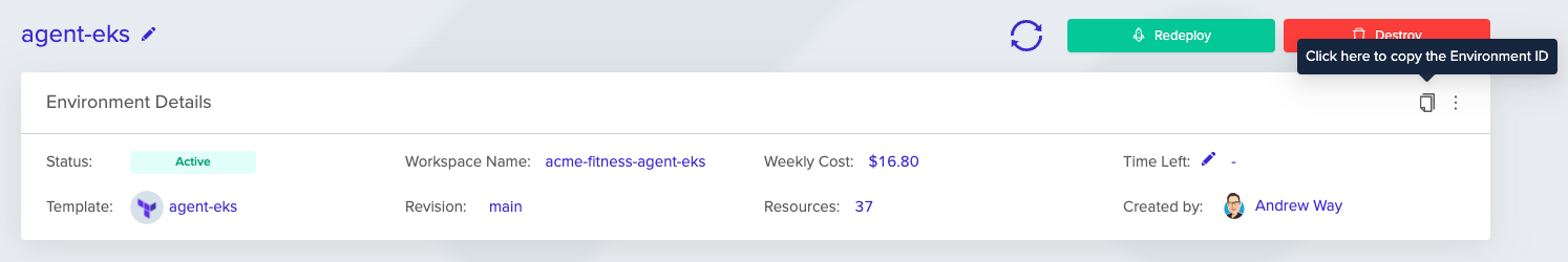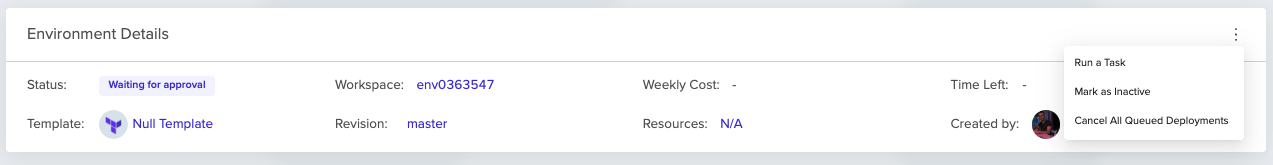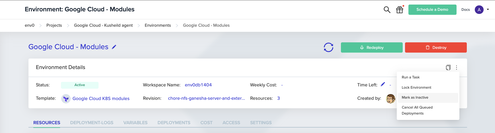 To view your environments, choose a Project and then select the Environments tab.The Environments screen shows a list of all the environments in the current project that you have permission to see. For each environment, you can see the template it came from, the revision (the Git branch on which its Terraform code resides), the owner, the status, the remaining time-to-live, and the number of cloud resources it currently consumes (this is relevant for Active environments). To perform actions on an environment or to view more details, click on it and then drill down to Environment Details. In the Environment Details screen, you can execute operations such as Destroy Environment or Redeploy. You can also view the logs from the latest deployment, the Terraform outputs, the Variables used in Deploy, and the Deployment History.