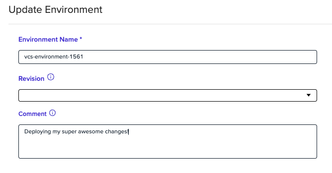 You can add a comment upon environment creation, re-deployment, destruction, and when running tasks. Adding comments lets you provide context and explanations for why the action was taken, letting others better understand the reasoning behind the changes, and making it easier to track and communicate about those changes within a team. To add a comment, write your desired text in the Comment input field: