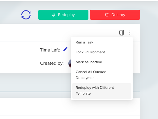As part of the redeploy, a new time-to-live needs to be set for the environment. If the time-to-live is not changed, the destroy time set for the original deployment will be used for the new one. If this date has passed, you will not be able to run the redeploy until a new time-to-live is set.In addition to time-to-live, new values can be assigned to other variables.