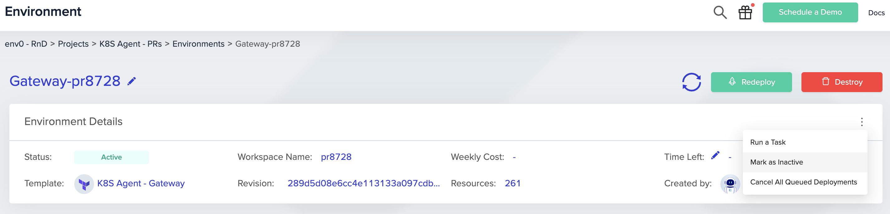 To help users manage their environments, env zero will automatically move destroyed environments to the INACTIVE list. As an Organization Admin you may also manually mark an environment as Inactive. Admins can manually mark an environment as Inactive by clicking the vertical three dots icon on the top right-hand side of the Environment page, and choose “Mark as Inactive.”