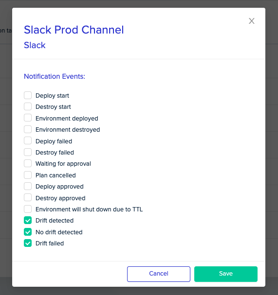 - Add Notification: To get notified directly in Slack,Microsoft Teams, email, or Webhooks when a drift has been detected, set up notification targets and events on your project settings under Notifications.