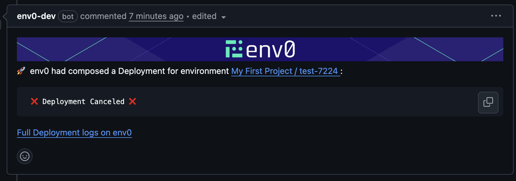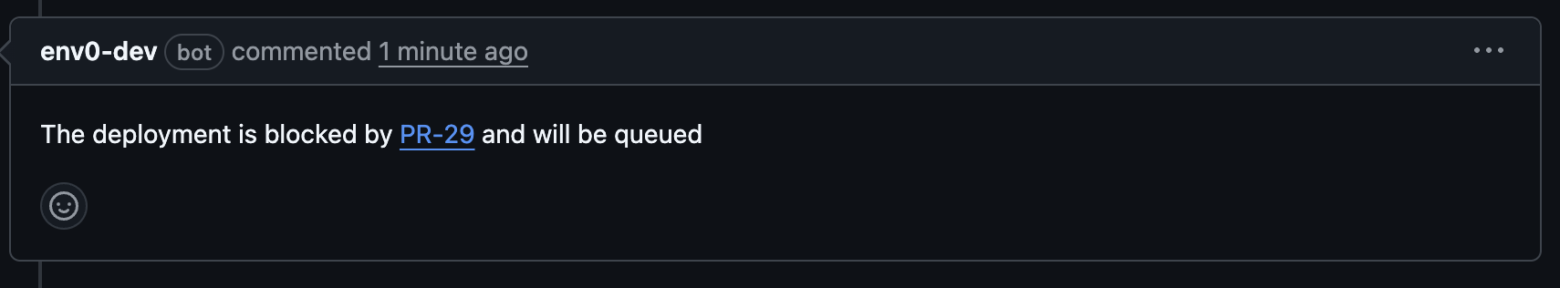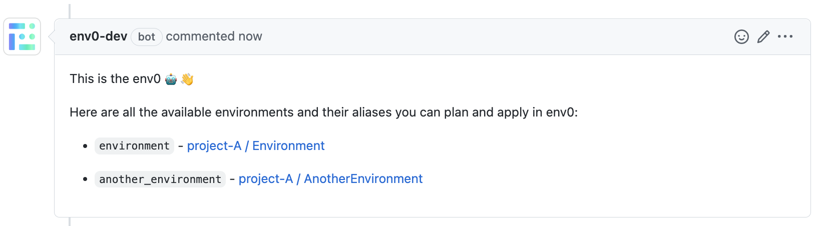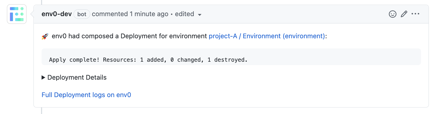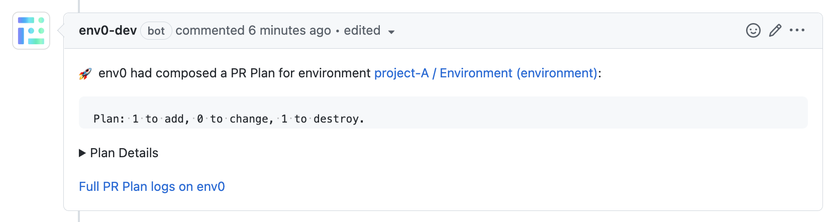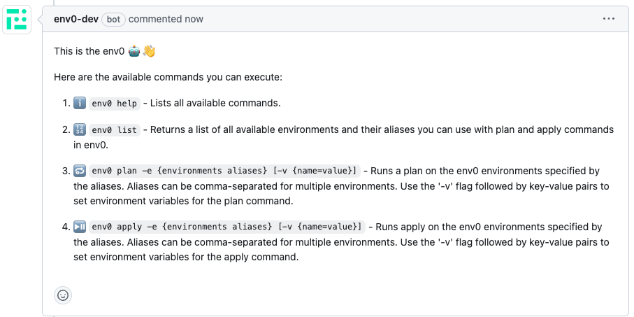 Commenting with env zero commands on a pull request makes it possible to interact with your env zero environments without having to log in to the env zero platform.
