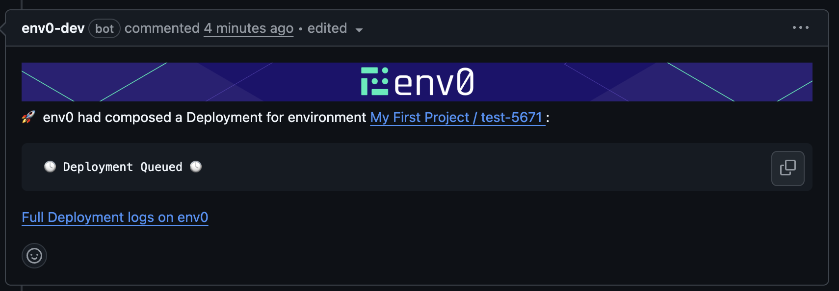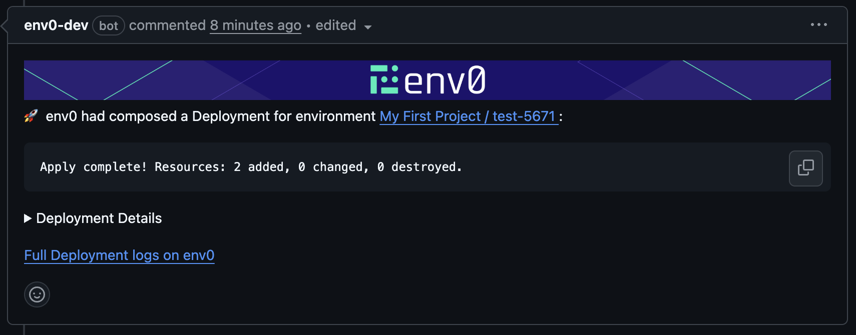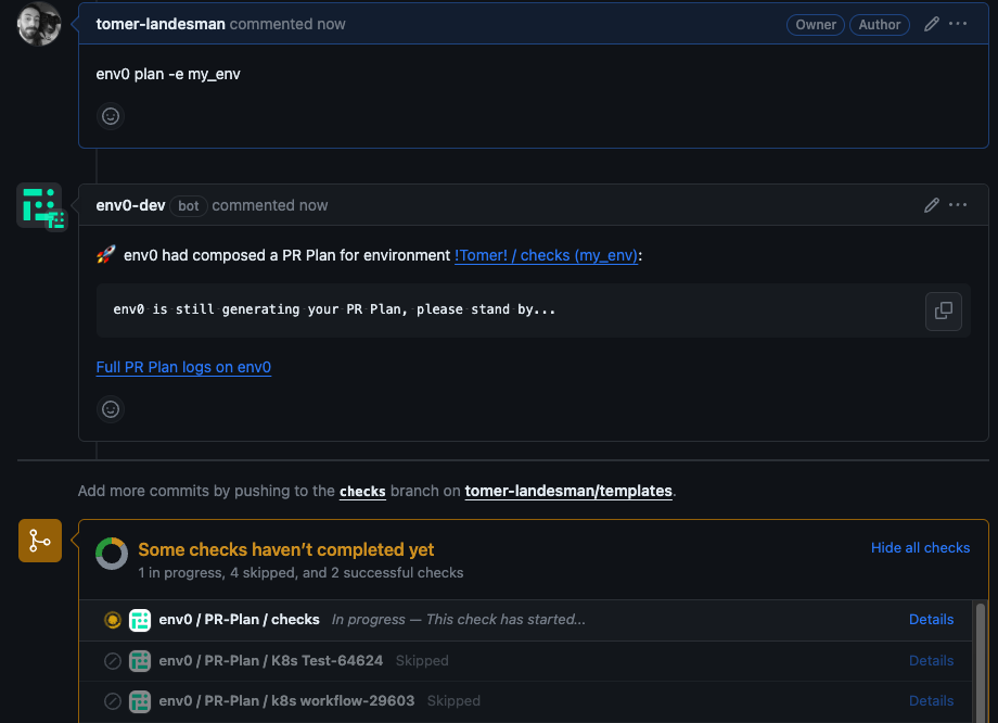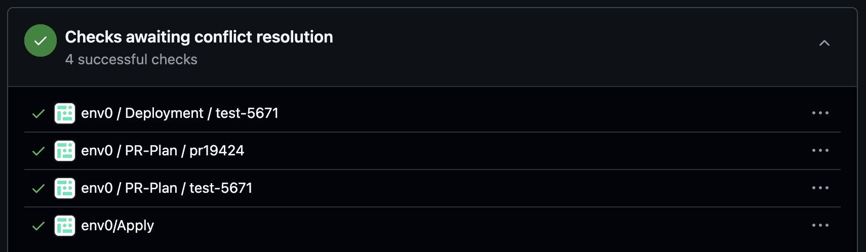 env zero offers the convenience of tracking the deployment status of your PRs directly from your Git provider’s interface. By integrating this feature into the familiar UI, you not only gain visibility into deployment statuses, but also leverage it to enhance your CI pipeline, using checks to enforce successful infrastructure deployments.