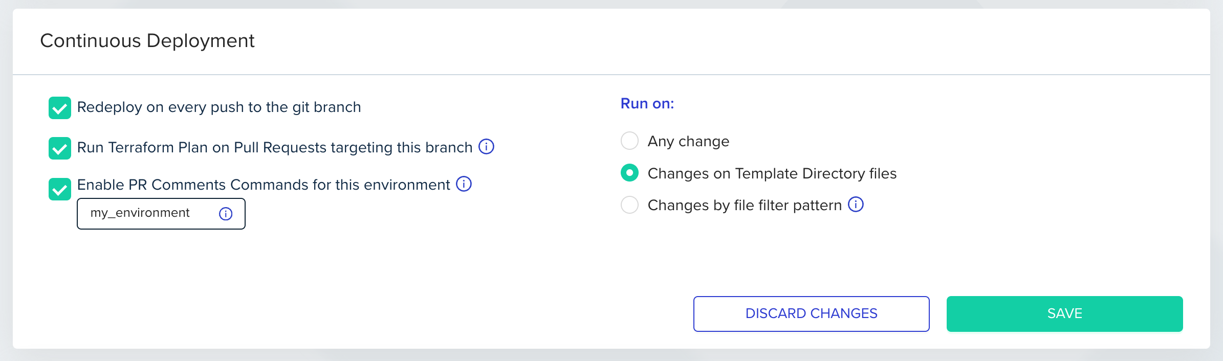 - The environment needs to have originated from a VCS-integrated template, and its configured revision must be the same as the base branch (target) of the pull request