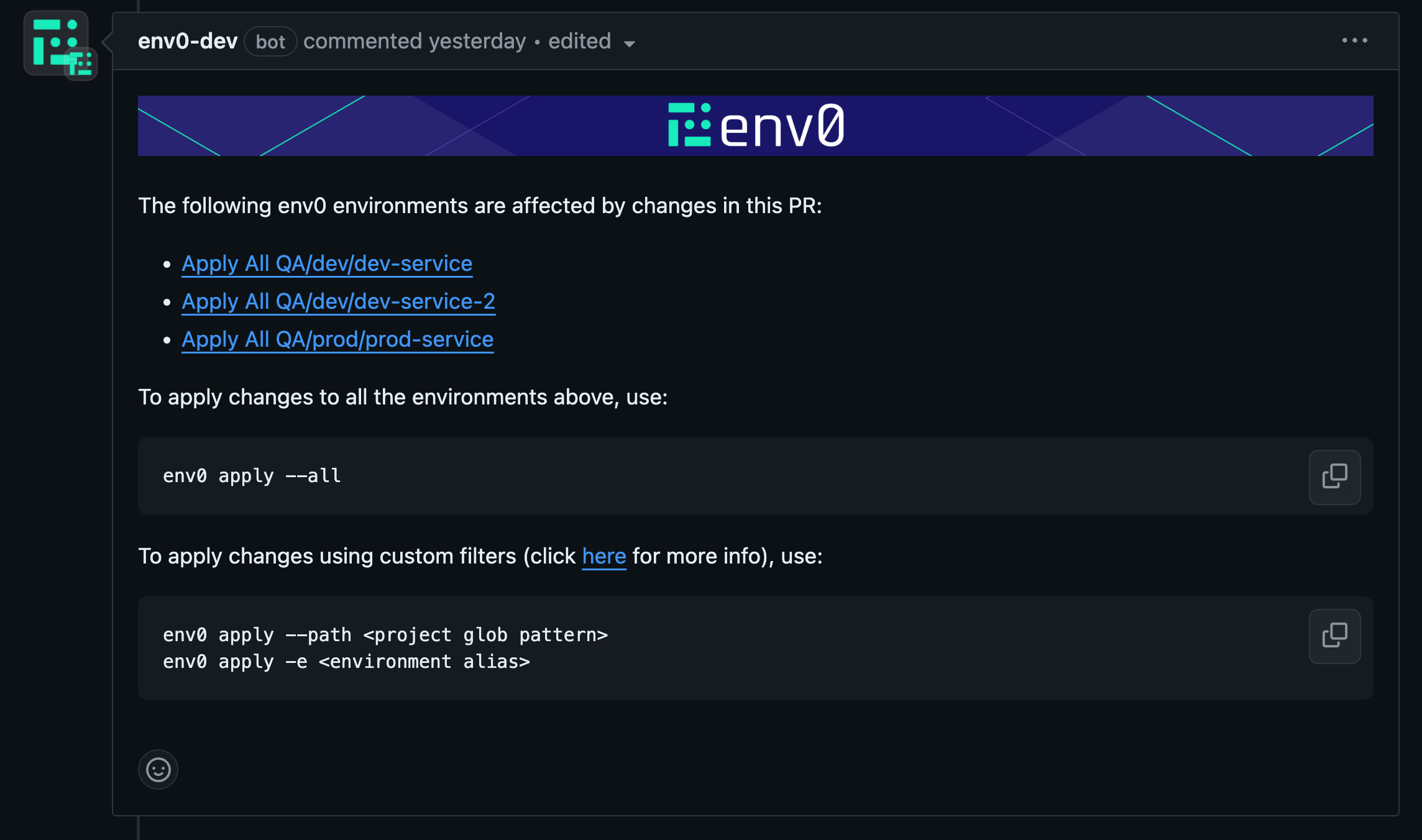 Every PR push will generate a PR comment, indicating which environments are affected by changes to this PR. An environment must enable the ‘Enable PR Comments Commands for this environment’ to be detected as affected, as described in the Configuration above. Below is an example of a comment which lists three affected environments and their full paths: