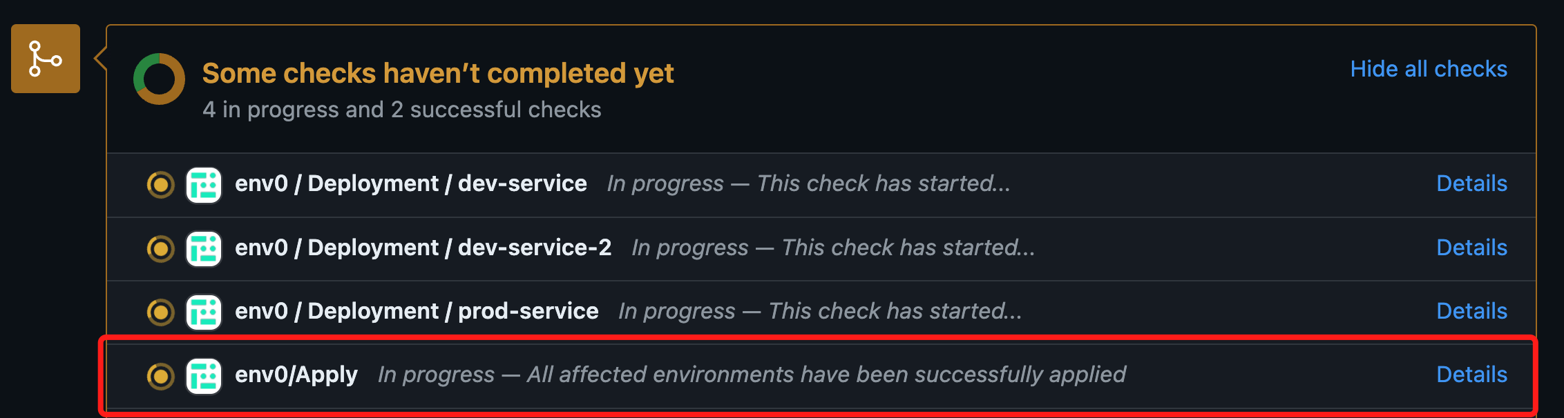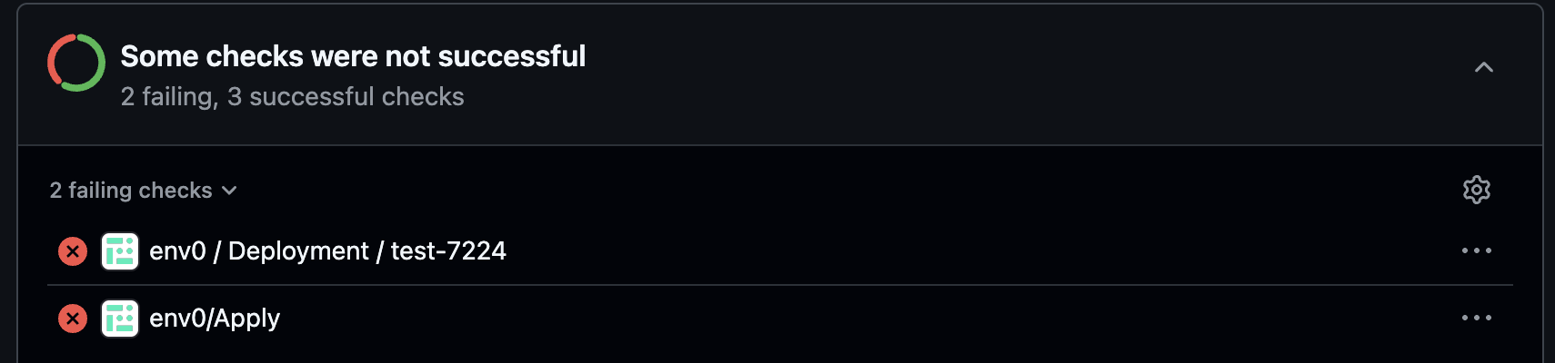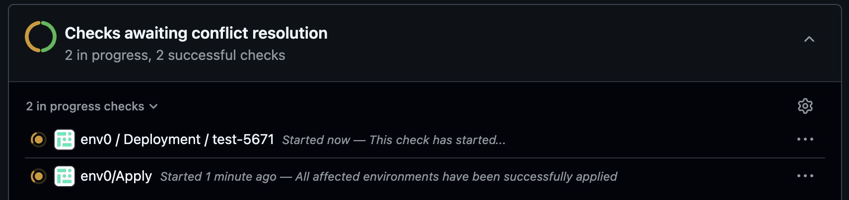 status once all the environments listed in the affected environments comment have been applied successfully. In case of failure in any of the deployments, the check’s status will be set to failure