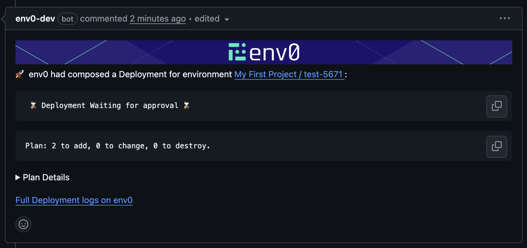 To require approval for applies triggered by PR comments, you must enable the “Require approval for PR comment applies” policy in Organization Settings → Policies. With this policy enabled, running env zero apply will trigger a deployment that will wait for manual approval.Once the plan step finishes, the plan results will be posted as a comment on the PR: