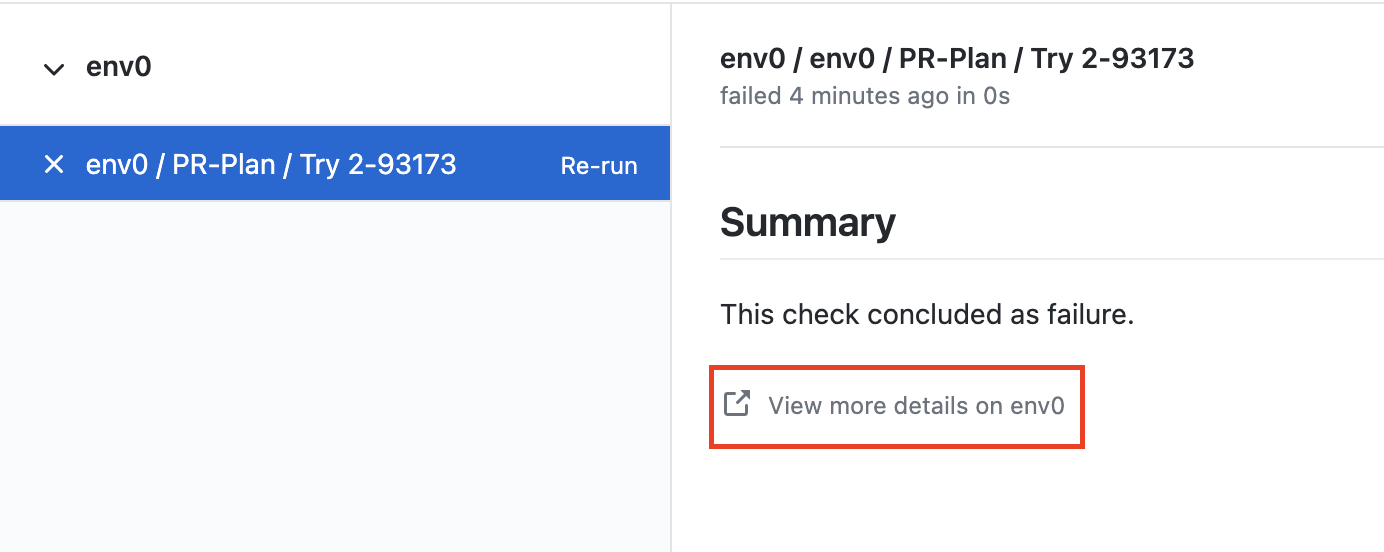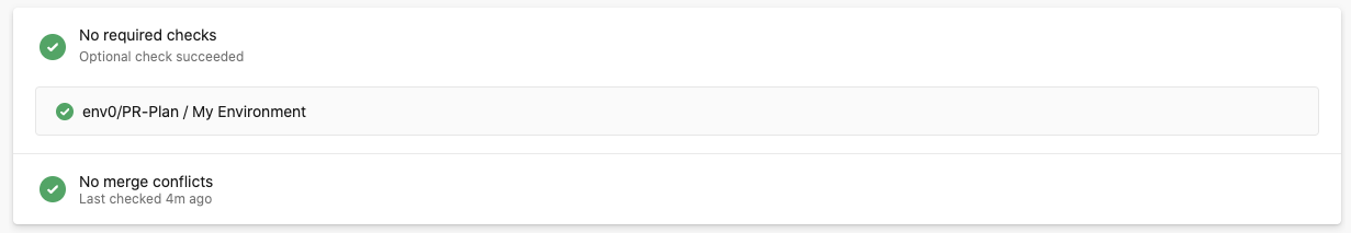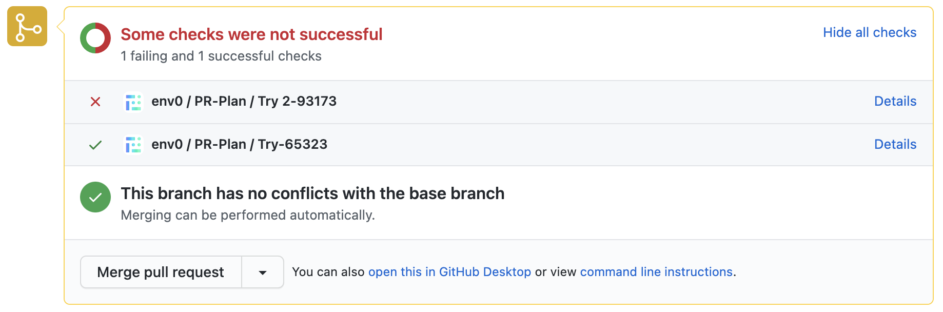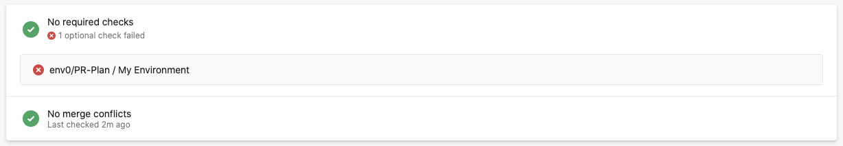 env zero will set a status check on your pull request.The status will be set to ‘failing’ when the run had failed to generate a Terraform plan, and ‘successful’ when a plan was generated.
