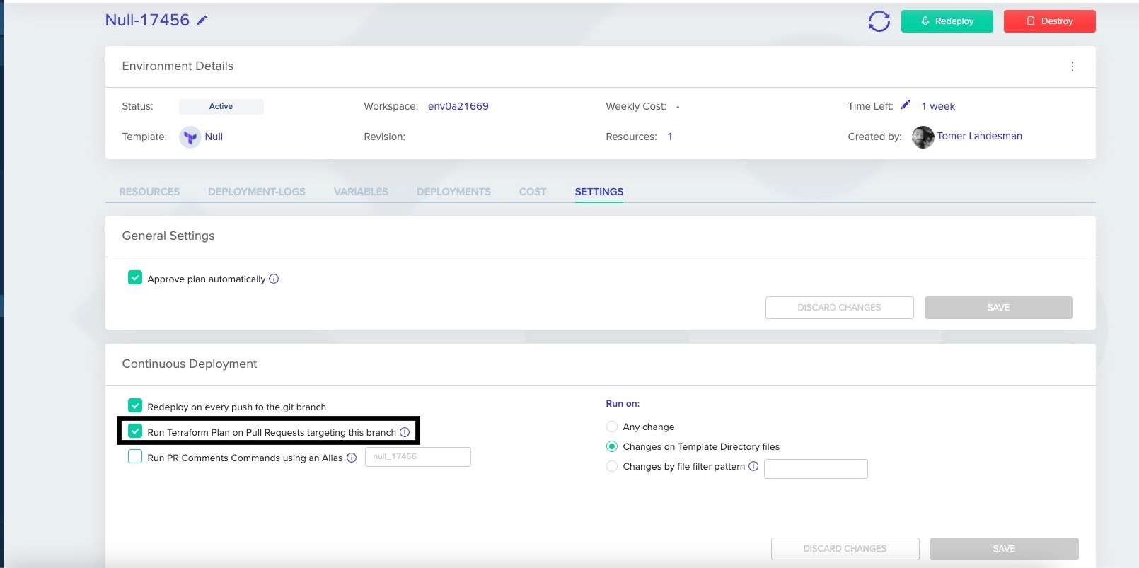 Go to your existing Environment in env zero and head to the Settings tab.Under Continuous Deployment, enable Run Terraform Plan on Pull Requests targeting this branch.