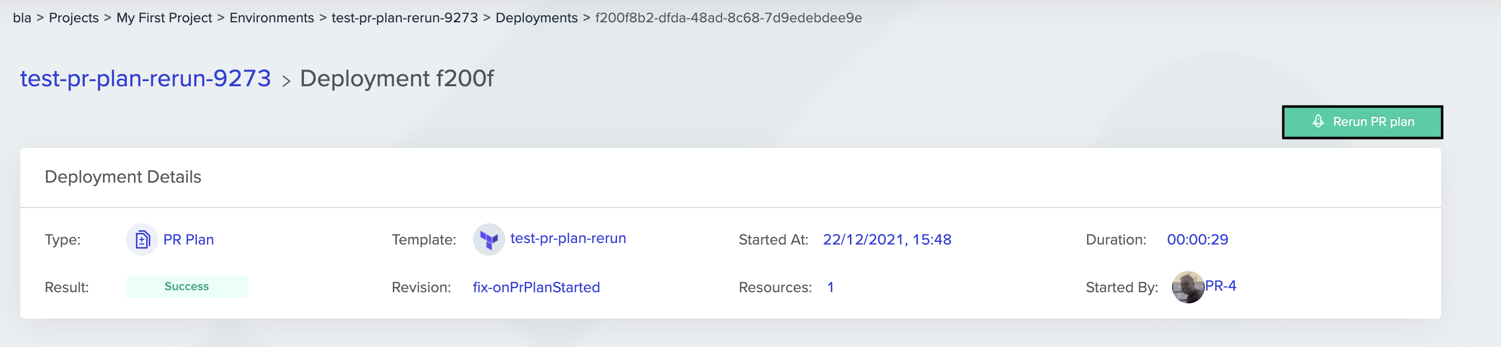 you can rerun a PR plan deployment, the newly created deployment will be an exact snapshot in terms of commits and code source of the original Pr plan.