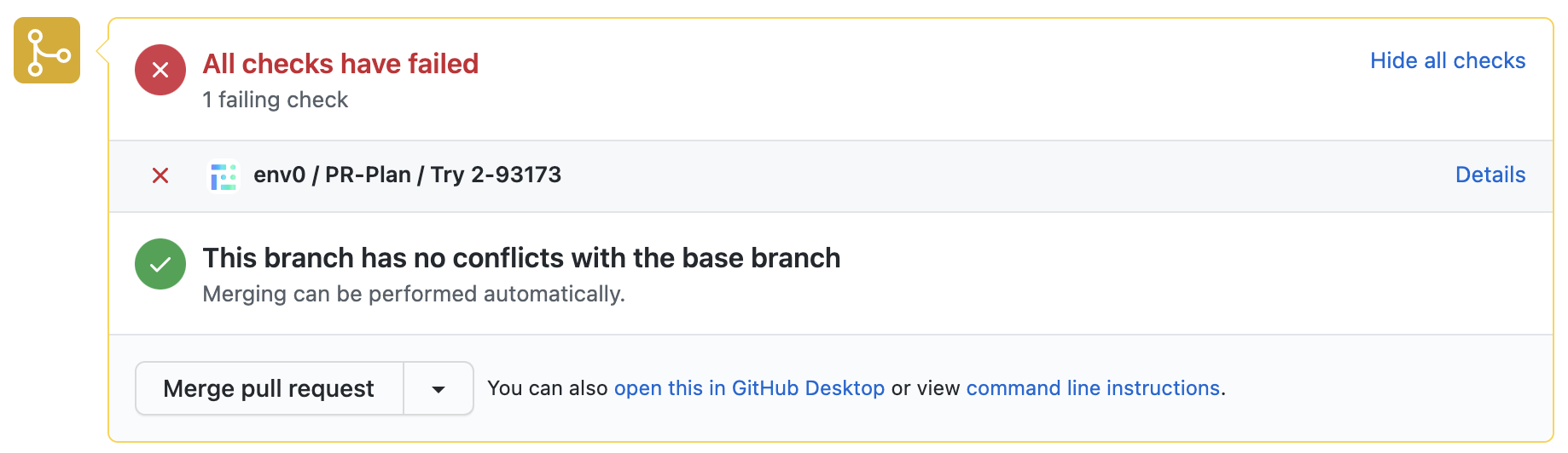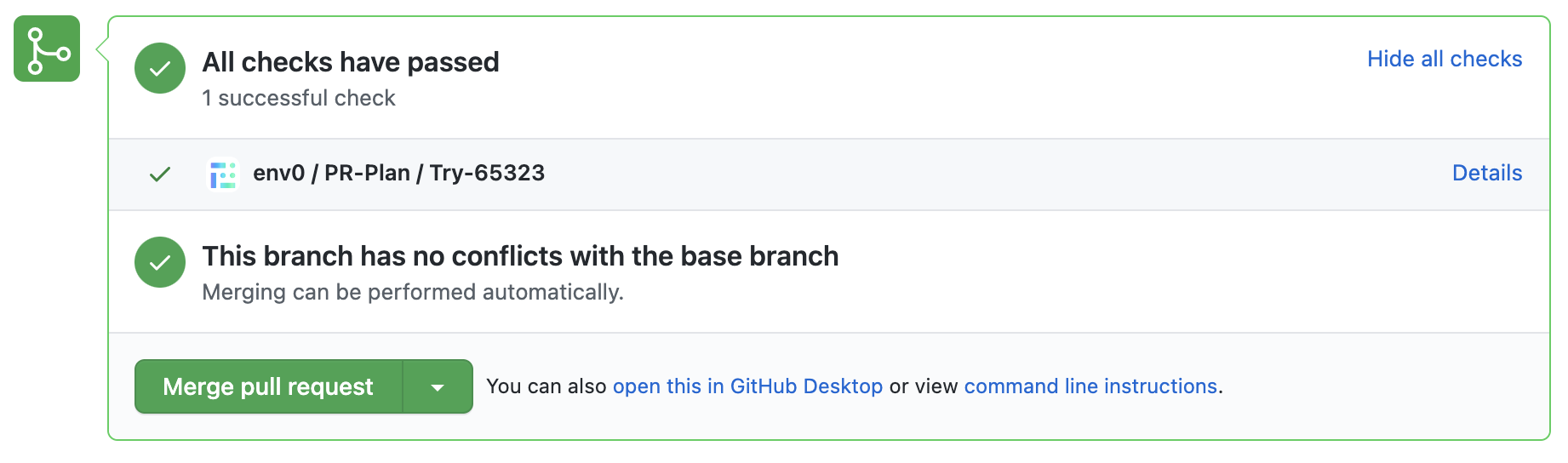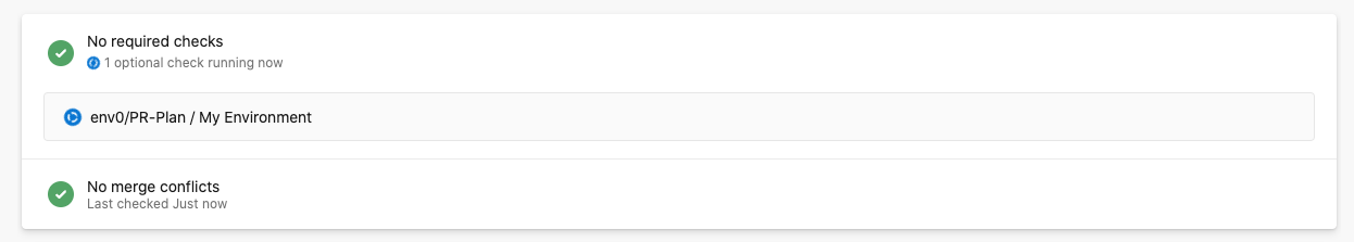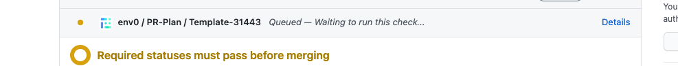 env zero will set a status check on the commit you want to merge in the pull request. The status will be changed to ‘failed’ when the run had failed to generate a Terraform plan, and ‘successful’ when a plan was generated.- When the PR plan is pushed to the queue: