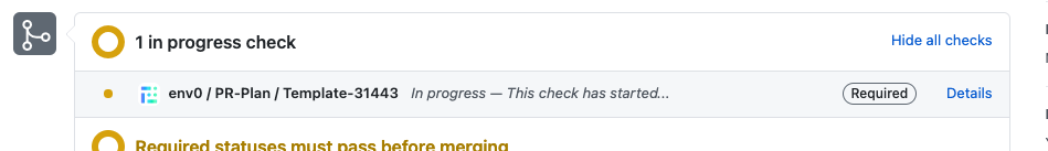 env zero will set a status check on the commit you want to merge in the pull request. The status will be set to ‘failing’ when the run had failed to generate a Terraform plan, and ‘successful’ when a plan was generated.- When the PR Plan starts running, the commit will be labeled as ‘in progress’: