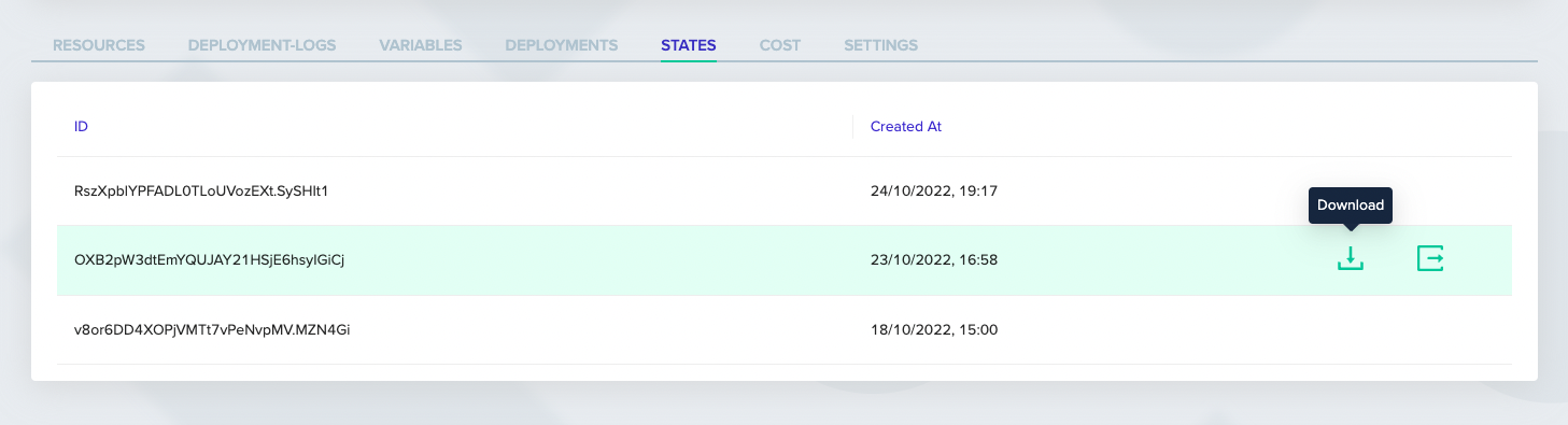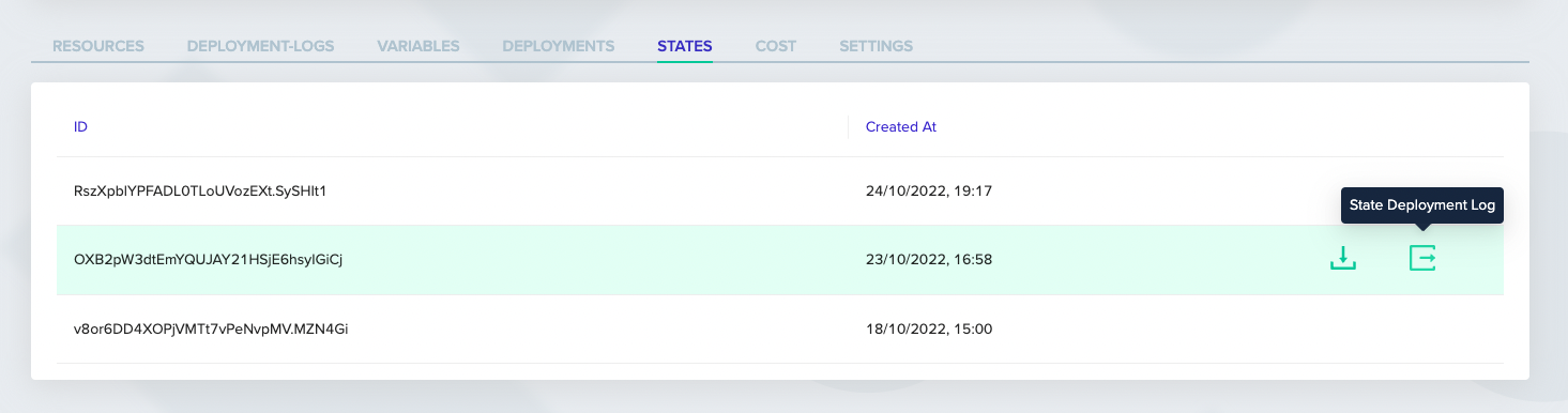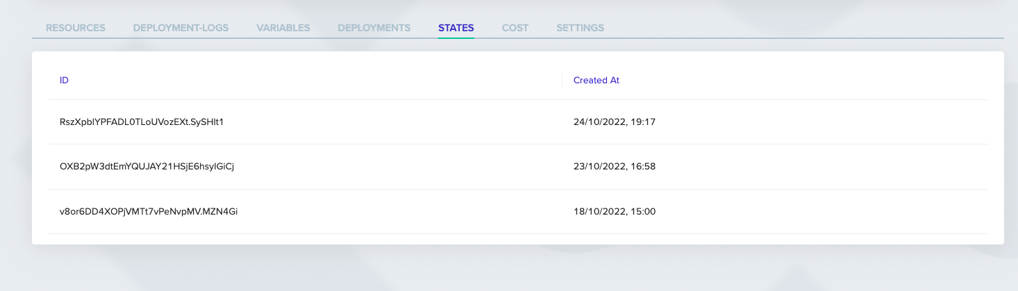 After successfully deploying an environment with a Remote Backend, you would have access to the States tab on the environment page. There you should see all the state versions, organized from latest to oldest.