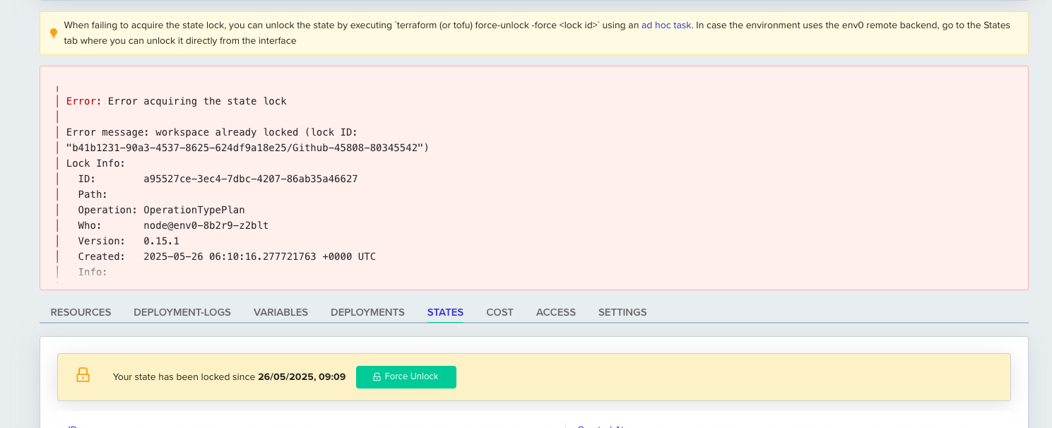 When working with Terraform or OpenTofu, you might encounter a scenario where the state becomes locked. This usually occurs when a previous deployment did not complete successfully—due to an error, crash, or manual interruption. In such cases, the workspace retains a state lock to prevent conflicting changes during concurrent deployments. To resolve this issue, you can manually force unlock the state. This action clears the lock, allowing you to re-run your deployment safely.How to Force Unlock