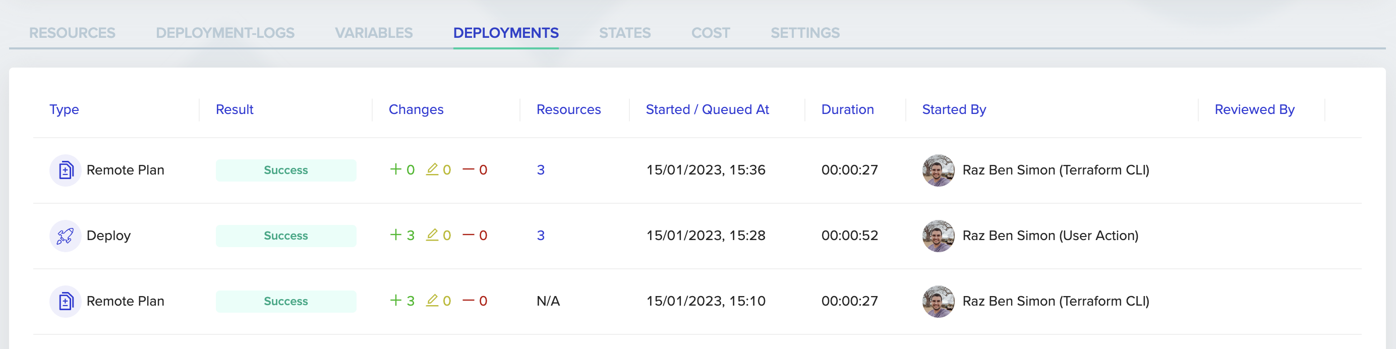env zero UI can show you each remote plan deployment that has occurred, accesses its plan logs, and gives you visibility and audit on who actually trigged it from their local environment.