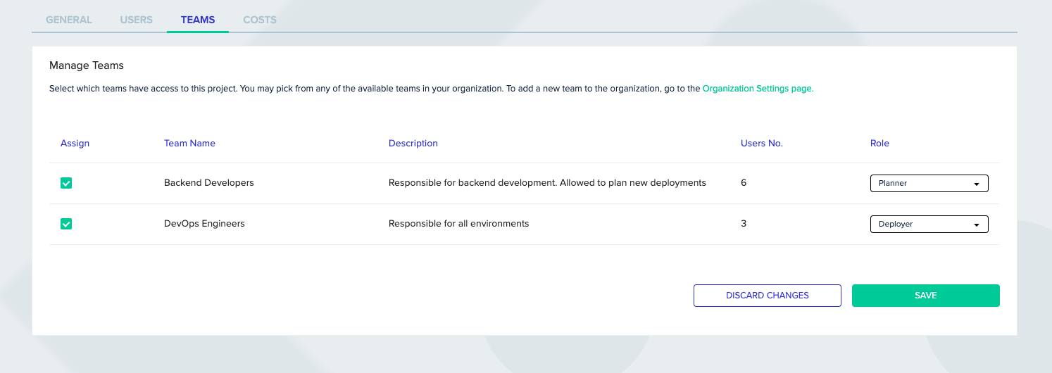 - You will see all teams for the organization, assign your desired Teams to the project by clicking the check mark and picking a role for that team from the dropdown.