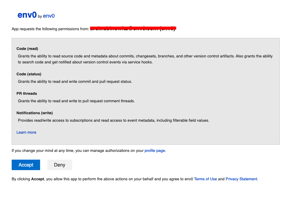 policy within your Azure DevOps organizations that you wish to integrate with env zero (Organization Settings -> Security -> Policies, See image below).
