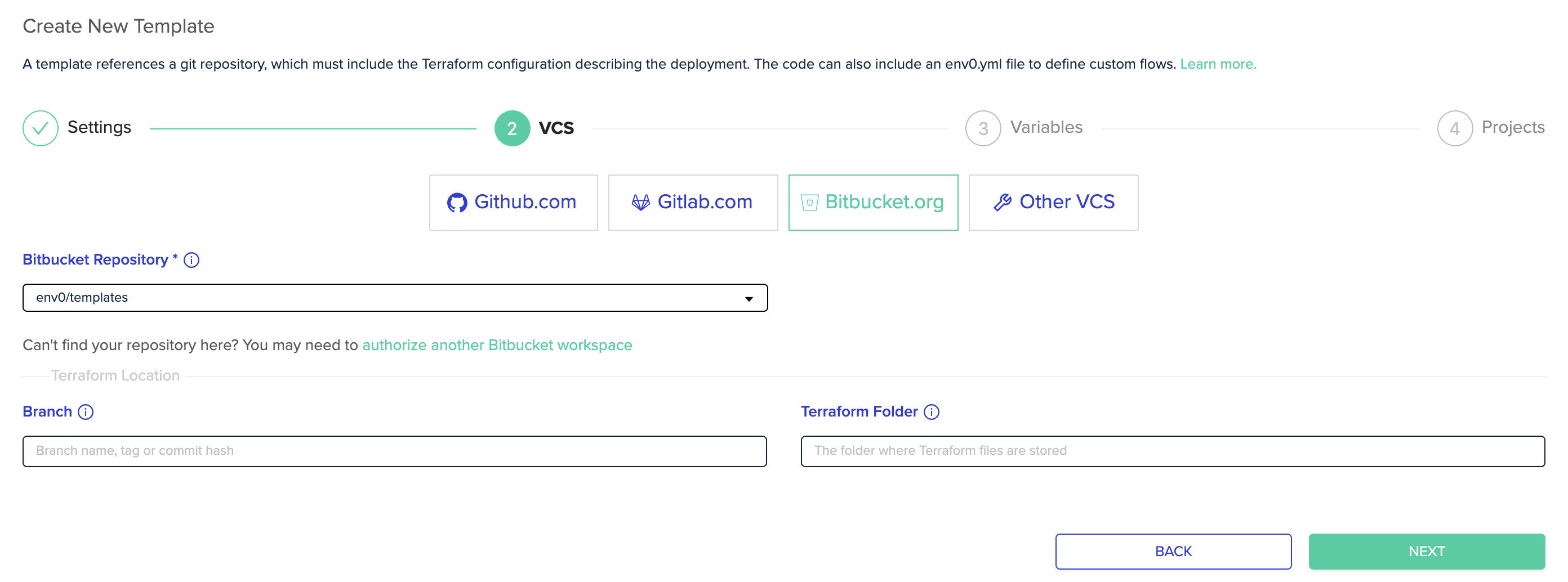 - Click on the VCS step. From there you can click on the Bitbucket.org button, and integrate with Bitbucket as you would for a new template.