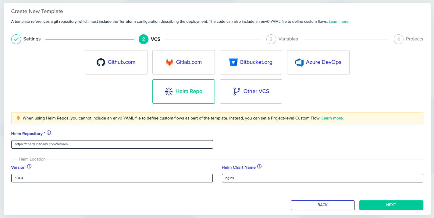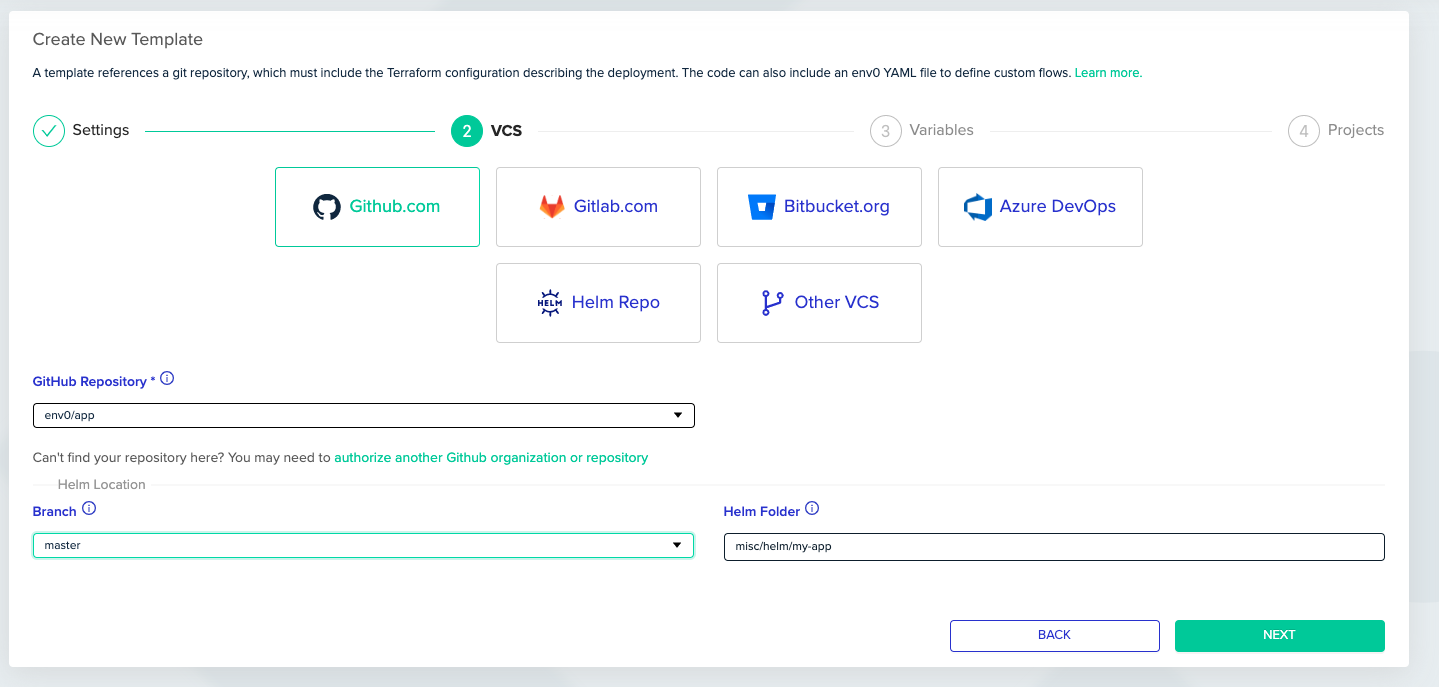 select the appropriate VCS provider and provide the path to your Helm chart code: