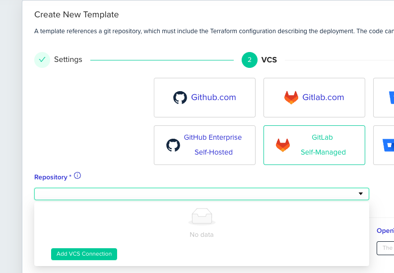 You can create a new connection in two ways; when creating a new template or through centralized management.Option 1 - Create VCS Connection from Template Creation