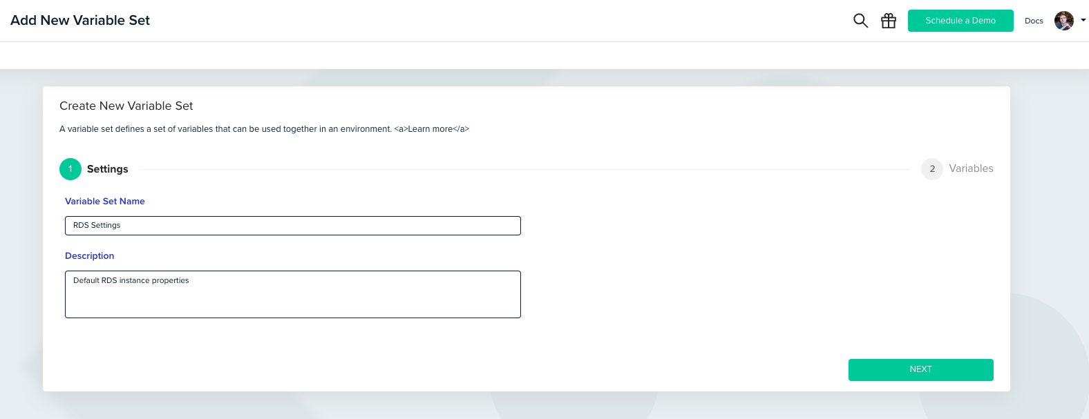 Variable Sets can be created on two scopes: Organization and Project. To create a new Variable Set, follow these steps: Click on the ‘CREATE NEW SET’ button located in the upper right corner. This action will open a modal window.In the modal window, proceed through two steps: