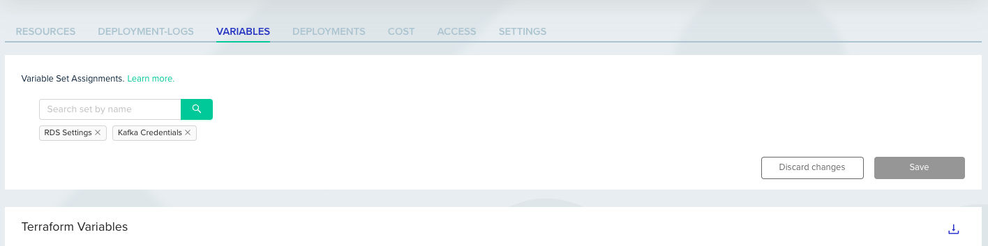 Assigning a Variable Set can be done on multiple levels – Organization/Project/Template/Workflow/Environment. The variables table for any of the mentioned entities contains a selector that allows you to mark the sets you would like to use.