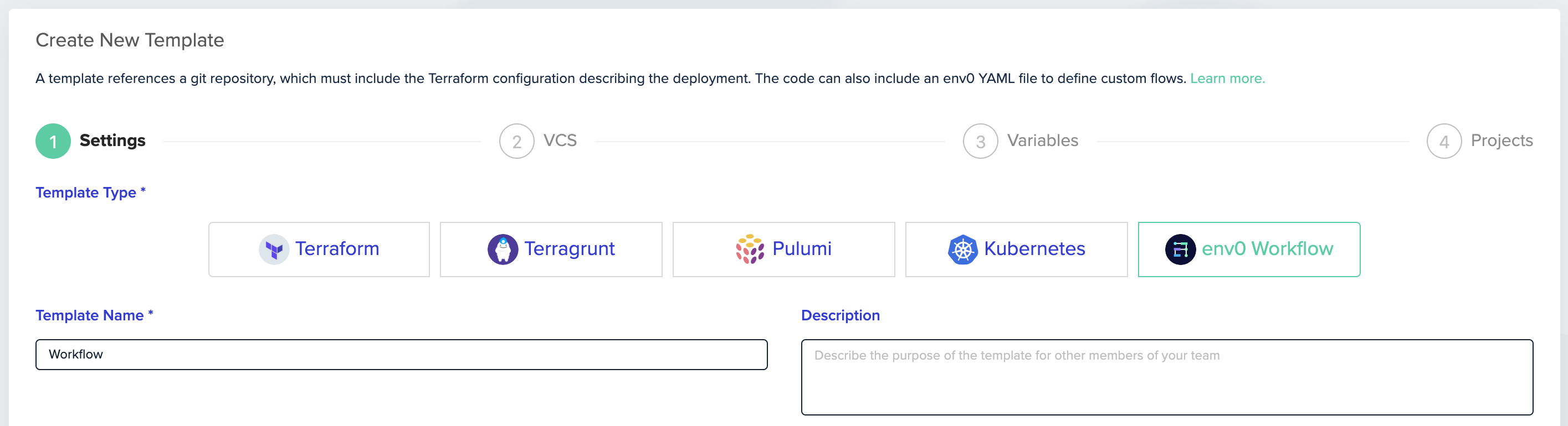 - Create a new template and select env zero Workflow as the Template Type: