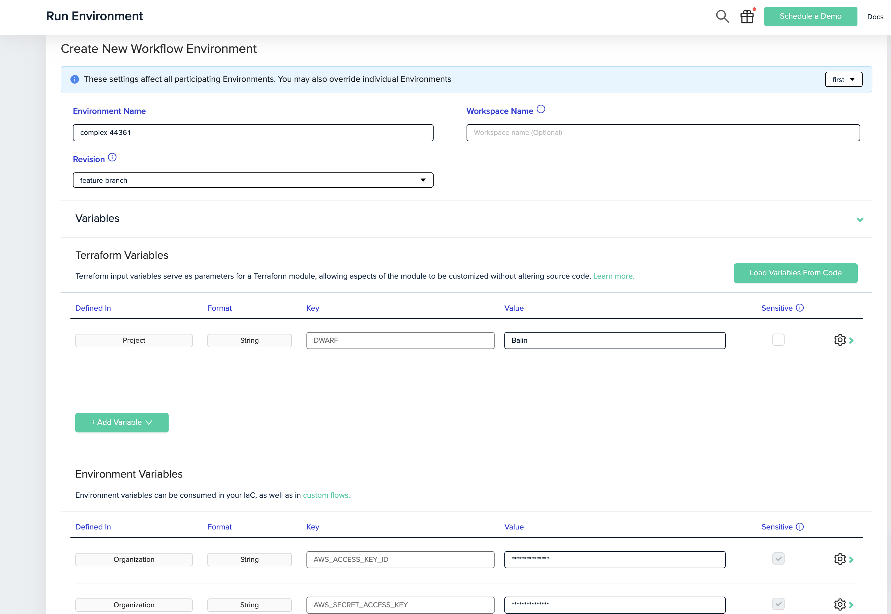 Overrides NoteThe values you set here for workspace and revision will override the ones youโve defined in the workflow file for the corresponding environment.If you would like to set the whole workflow to the same workspace name value, you can do so by setting the workflow workspace name, and leaving the sub environments blank.Note that since Terragrunt uses a working directory instead of workspace name, the workspace name override wonโt apply to Terragrunt template type.When marking the workflow as remote backend, you must provide unique names for each of the sub environments workspaces.