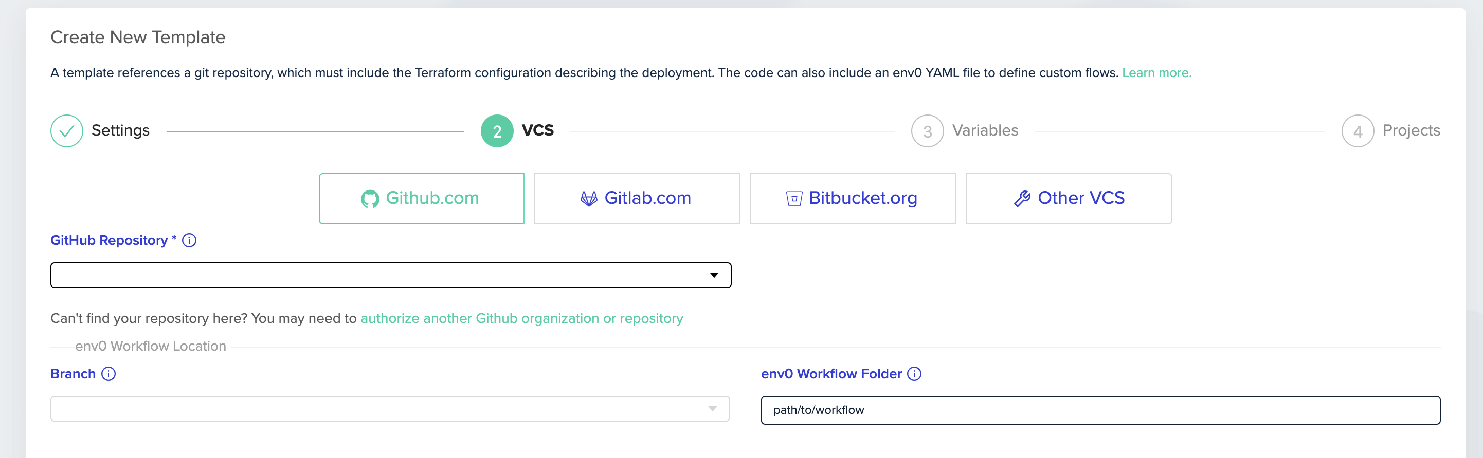 - vcs(optional, conflict with templateName): Information to integrate with the VCS and all the information used to create a template
