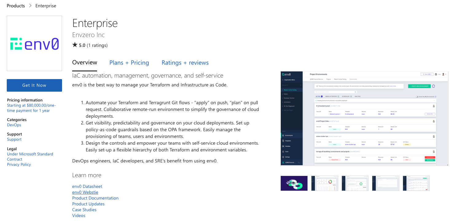 You can purchase env zero through the Azure Marketplace. Select the env zero product and then click onGet It Now.