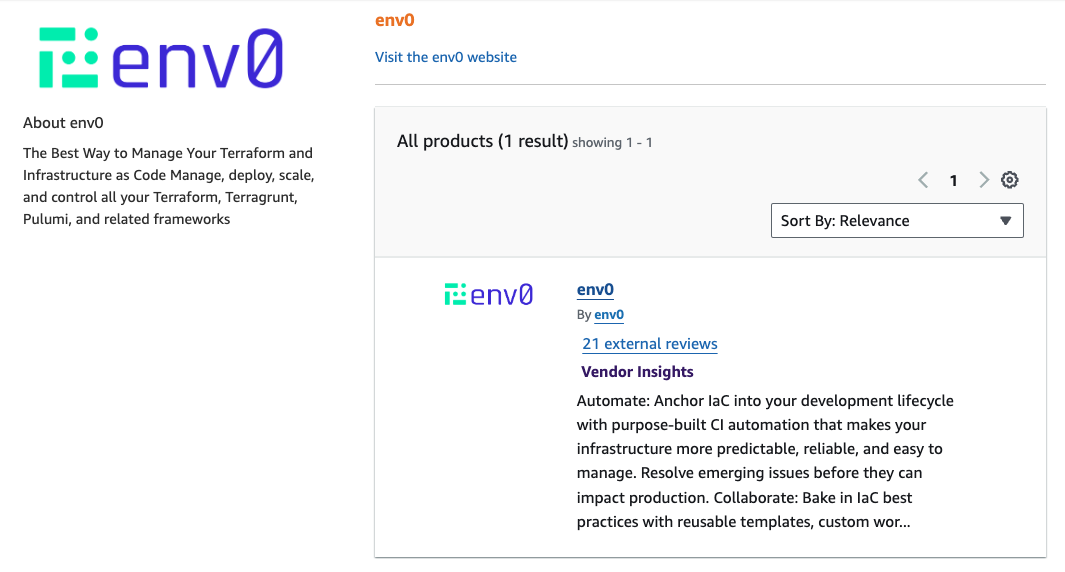 You can purchase env zero through the AWS Marketplace. Select the env zero product and then click onView purchase options.