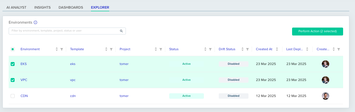 - Environment Exploration – Use the Explorer tab to review and compare all environments. Search, filter, and take bulk actions across multiple environments.