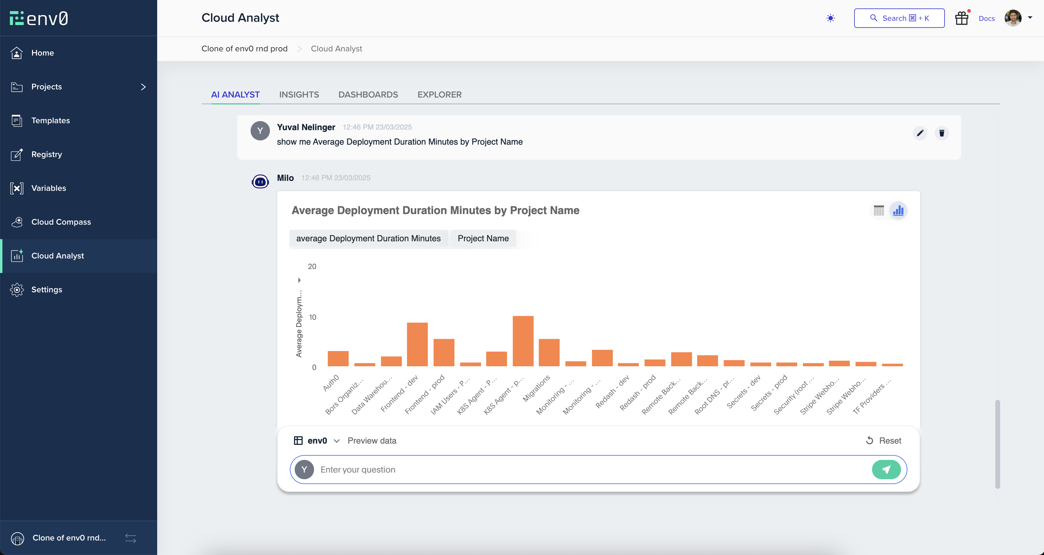 - AI-Driven Queries – Ask questions in natural language using the AI Analyst tab. You’ll receive a visual response—such as a chart or table—based on the env zero data model. From there, you can: