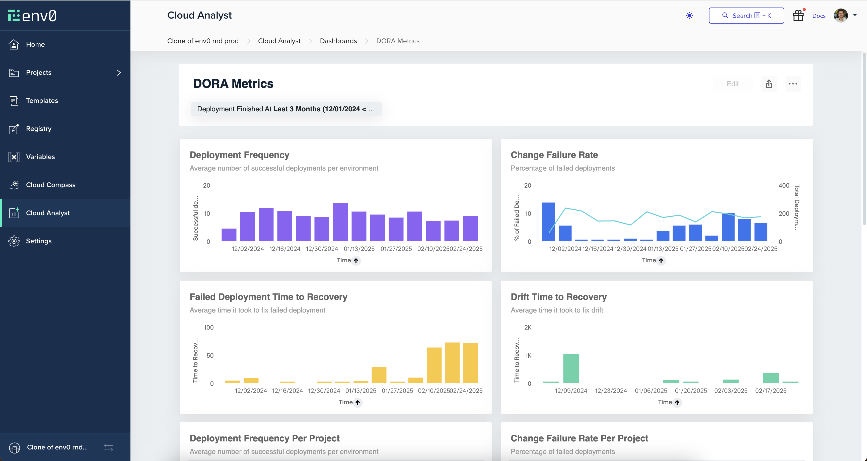 - Predefined Charts & Metrics – Access a library of dashboards answering common questions—like DORA metrics, drift trends, and deployment performance.