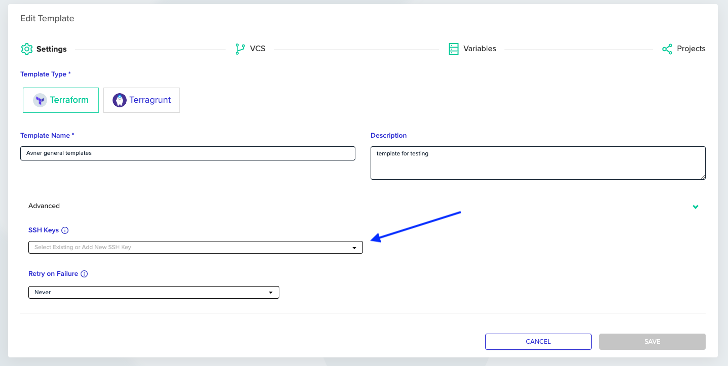 SSH Keysdropdown. Associate your desired SSH key with your template - Click the Save button to commit your changes.
