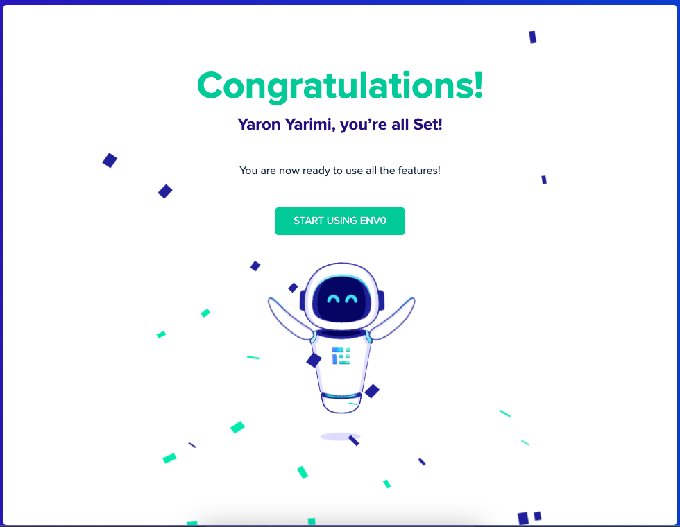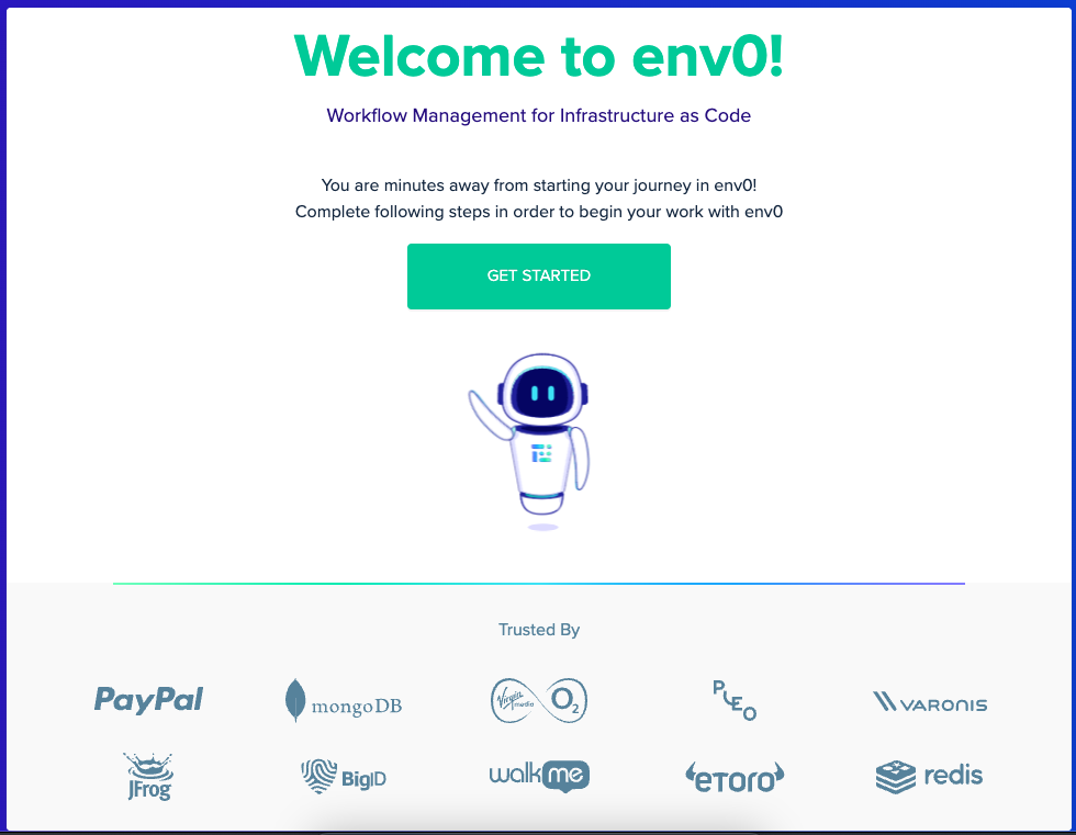 When you first login to env zero, you’ll notice the onboarding welcome page. Clicking on Get Started will take you to the onboarding process that will guide you through setting up and deploying your first environment in env zero.
