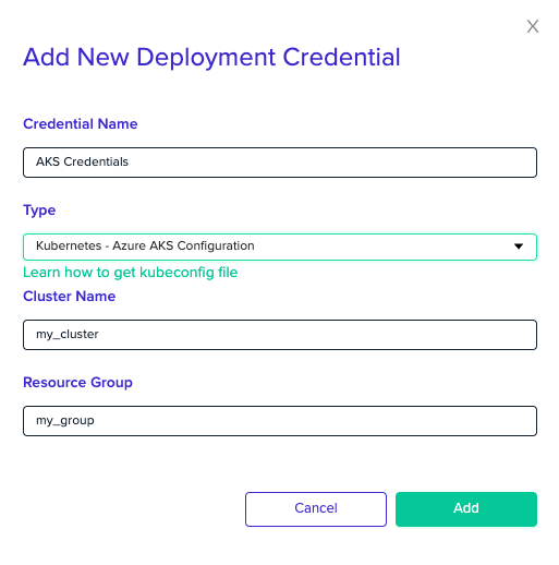 Select the Kubernetes - Azure AKS Configuration credential from the Type dropdown menu and enter your cluster name and resource group.