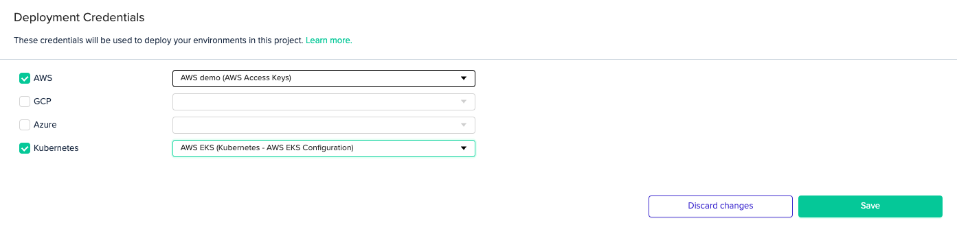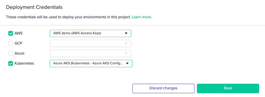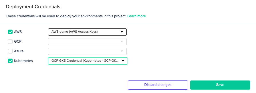 Generally, Cloud Credentials are defined per env zero project. These are translated into environment variables at runtime (like AWS_ACCESS_KEY_ID and AWS_ACCESS_SECRET_KEY for AWS). If you’d like to give different credentials to a specific environment, you could simply override the desired environment variables during deployment.Kubernetes