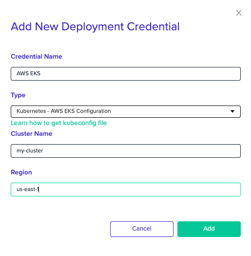 Select the Kubernetes - AWS EKS Configuration credential from the Type dropdown menu, then enter your cluster name and region.