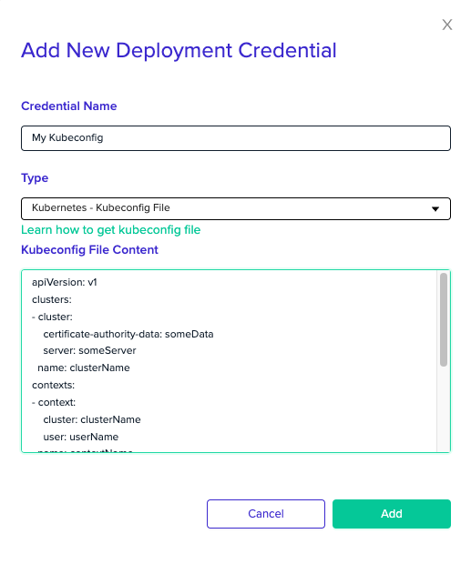 Select the Kubernetes Kubeconfig File credential from the Type dropdown menu and paste your validkubeconfig file.